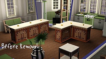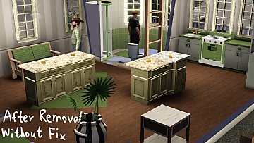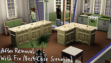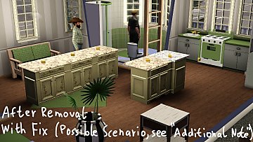 So, you may be wondering: What if the Fallback Index contains an ID about an object that is missing (like an uninstalled Store object)? It behaves as if the Fallback Index is set to zero: The object will quietly vanish (see 3rd image). This is the same in this case, where the Fallback Index of this particular counter island is set to itself. However, this does produce an additional problem because it can softlock the game (though it will probably rarely happen). As far as I have found out, this can only happen if you try to choose the counter island in the buy catalogue, but under normal circumstances the only problematic variant of this counter island is not available in there (unless you make it so). My guess is that the game tries to follow the chain of Fallback Indeces until it finds an object with a Fallback Index of zero. But since the Fallback Index of this counter island points towards itself, it gets stuck in an endless loop which causes the game to freeze and essentially softlock. As long as this fix is inside your Mods folder, this cannot happen.
