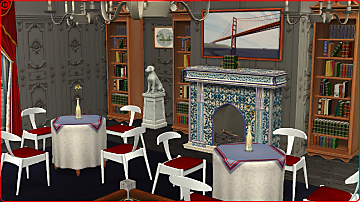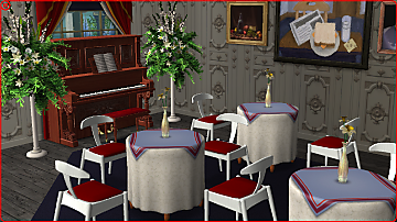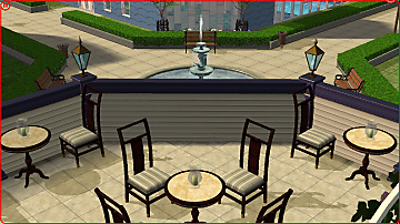 The restaurant has 2 dining floors and a balcony overlooking the grand fountain in the lot. Very fancy! I added a piano on the first floor so your sim could perform for tips if the restaurant is full.