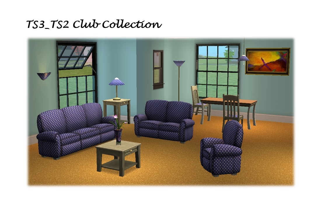 At first glance some of the items seem almost identical to the Sims 2 Club Collection; so I have opted to use different color woods and a modern geometric fabric rather than the default set.