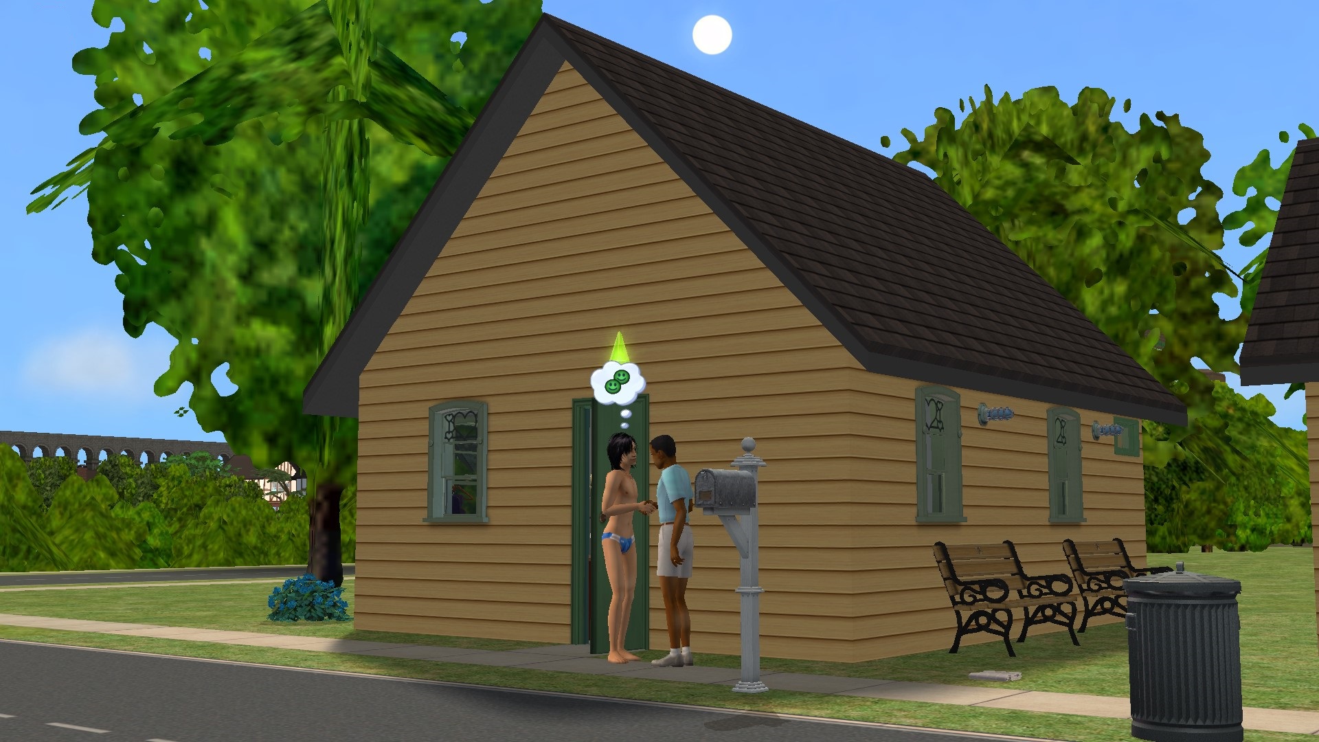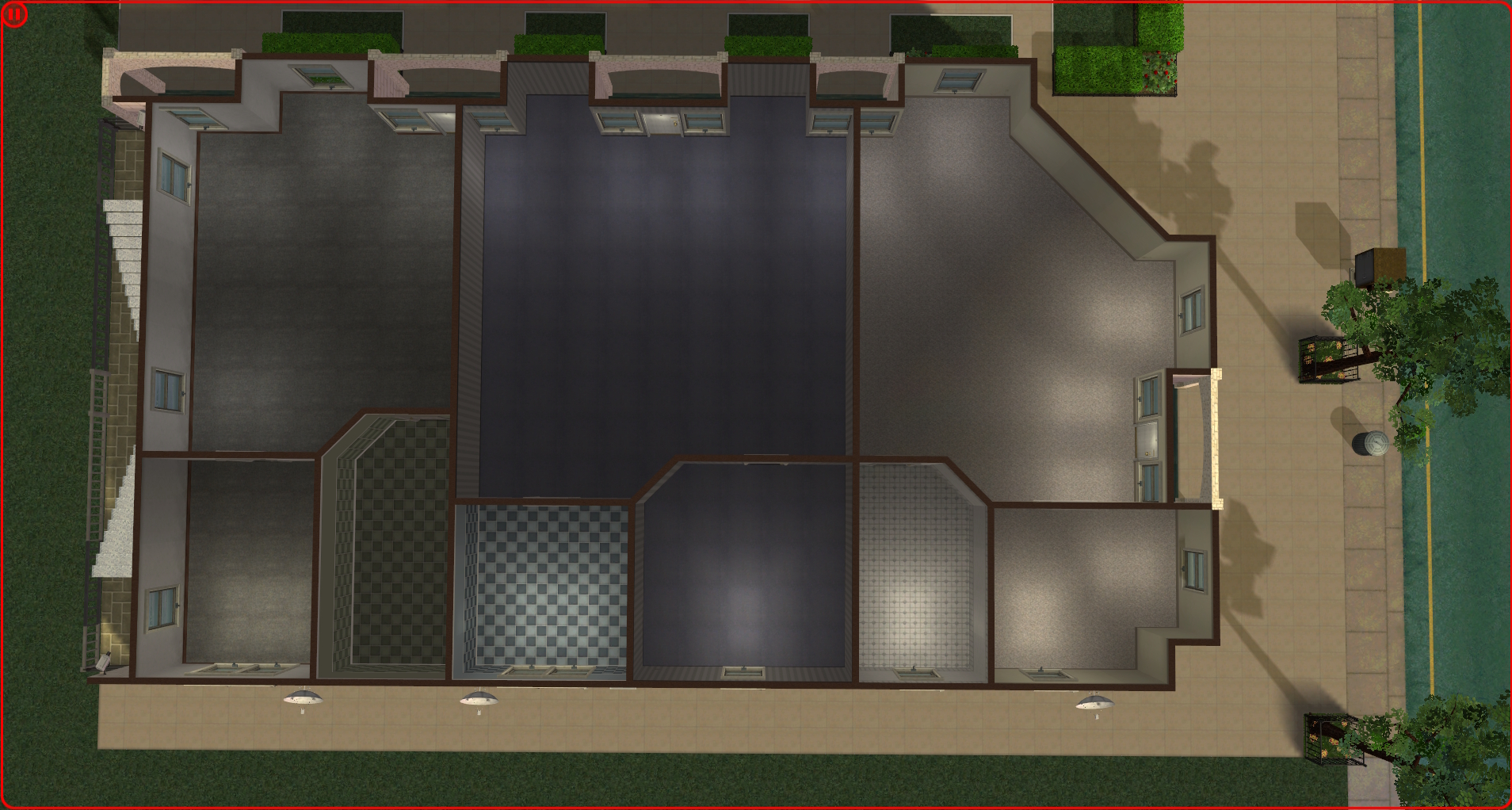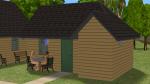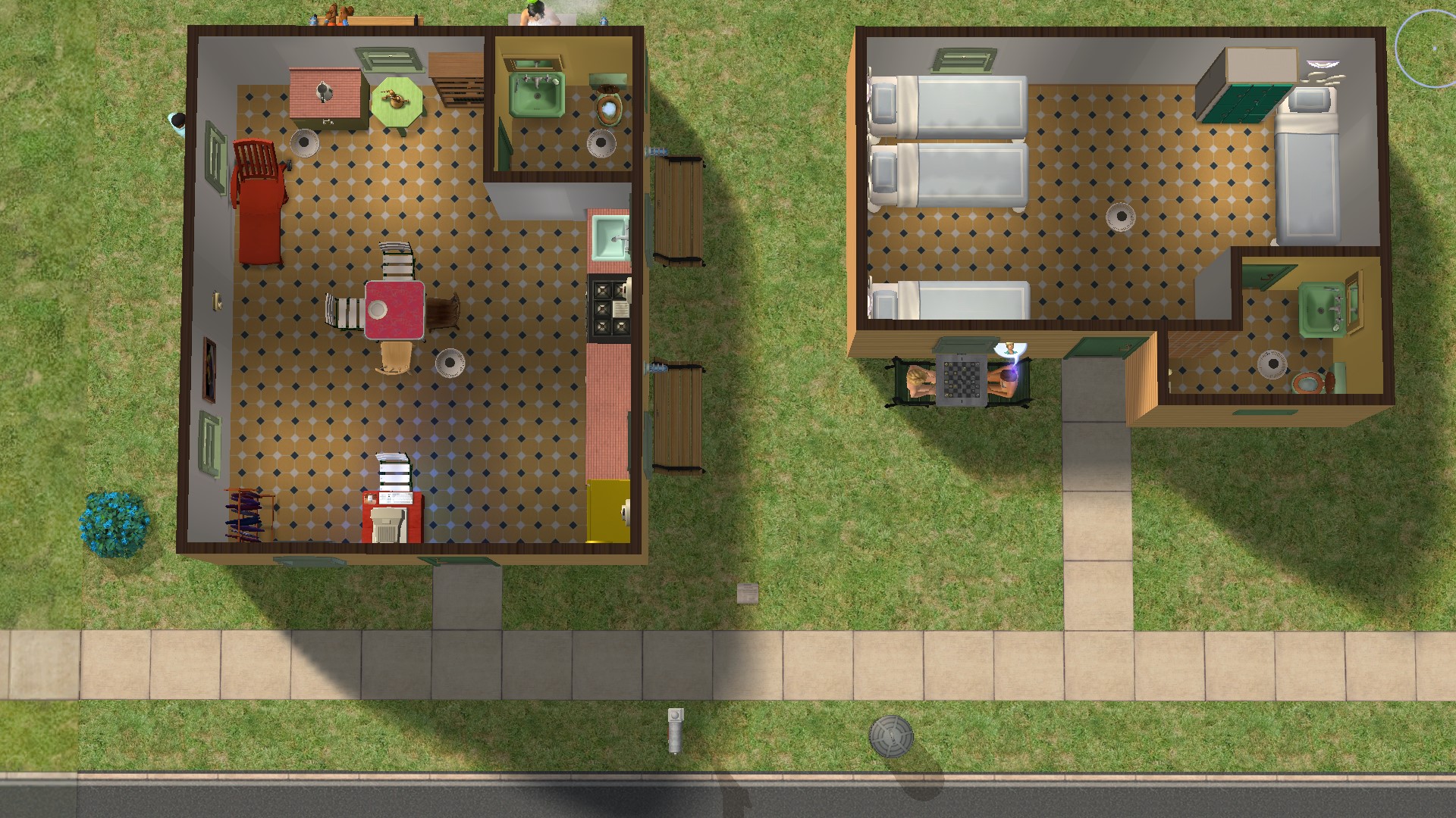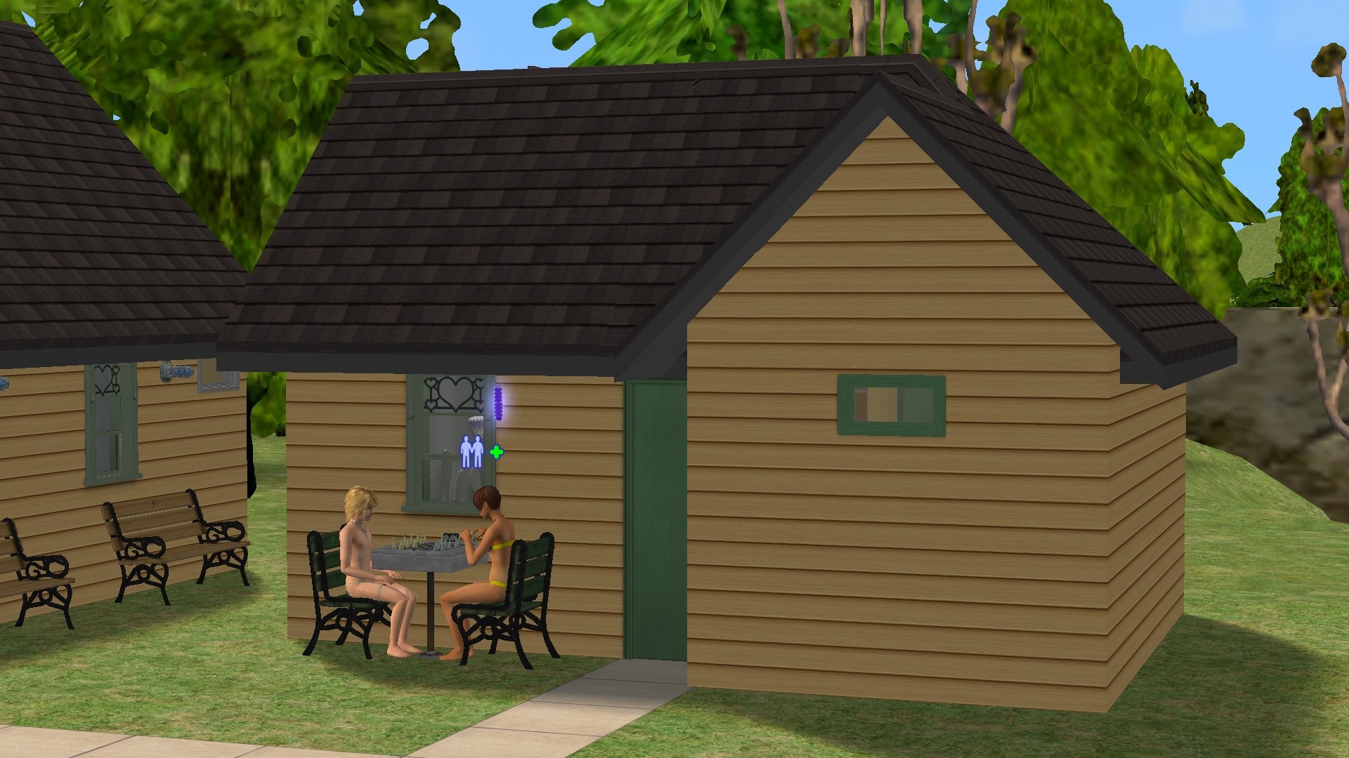 However over time I found I was playing these Sims for longer and longer. I suppose I just like hanging around with Sims, and sharing in their lives. I fairly soon found myself playing them until the welcome wagon came, so they could meet some of the Sims who lived in the neighbourhood. When these guests left they'd be exhausted. The best they could do on the lot was to nap fitfully on a park bench or a recliner. Or take a taxi to a community lot where they could buy an energy drink from a CC vending machine. All told it was ceasing to be fun, either for them or for me. It was obvious they needed beds, but there was no room to put one. Over the last few months I have added sleeping facilities to the downtown and Bluewater changing huts, and built a new larger changing shed in Monopolis, but there was still nowhere to sleep at the Veronaville hut itself. So when Gerald Park and Horace Blue moved out and became townies a couple of days ago, I decided to take the bull by the horns and build a second hut for the future townies to sleep in.