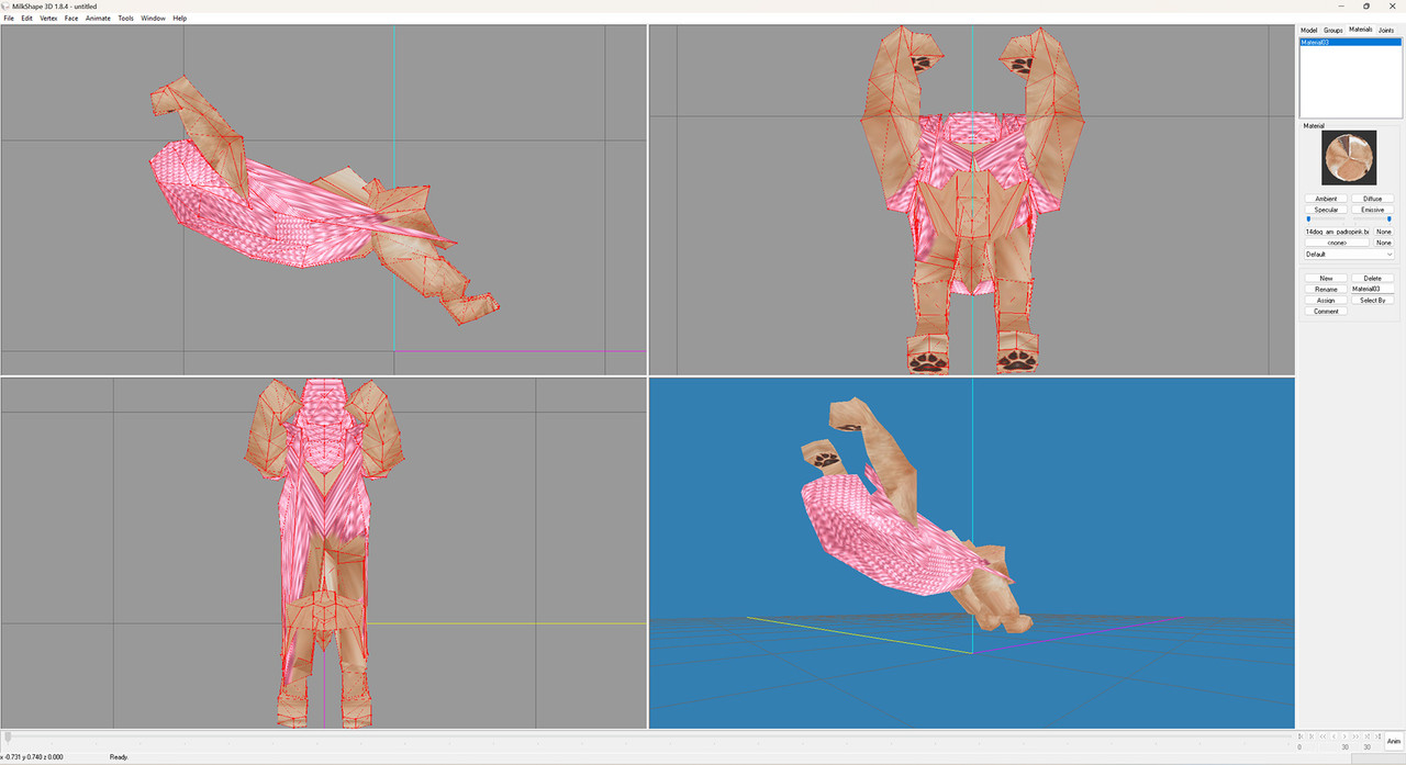 Does anyone know why the body mesh of a pet (even with a dog skeleton in MilkShape3D) looks like this (-photo 1-)? The head looks perfect (-photo 2-). When exported from the game, it doesn't look too bad, although it does have some imperfections, like protruding spikes, as shown in (-photo 3-) where I compare the edited body to a standard one that's the same but wasn't processed in MS3D, and those spikes don't appear in the standard one. It doesn't look bad when static (-photo 4-), it's a subtle issue with movement. I can live with those protruding spikes, but if I wanted to modify the body in MS3D, for example, to make it thinner like a Chihuahua's, I wouldn't know how because the mesh looks like a scribble.