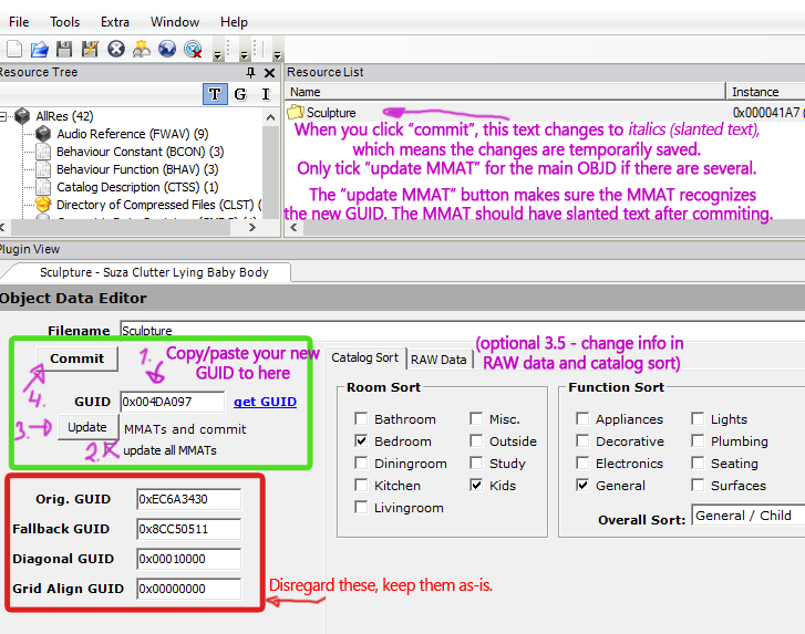 If there are multiple OBJDs, you should assign new GUIDs to all of them, but ONLY do the MMAT step for the main OBJD/GUID. If the item already has a MMAT, and if you haven't already done anything, you can find the main GUID in the MMAT. If not, it's usually the one without any numbers/letters by the OBJD name.