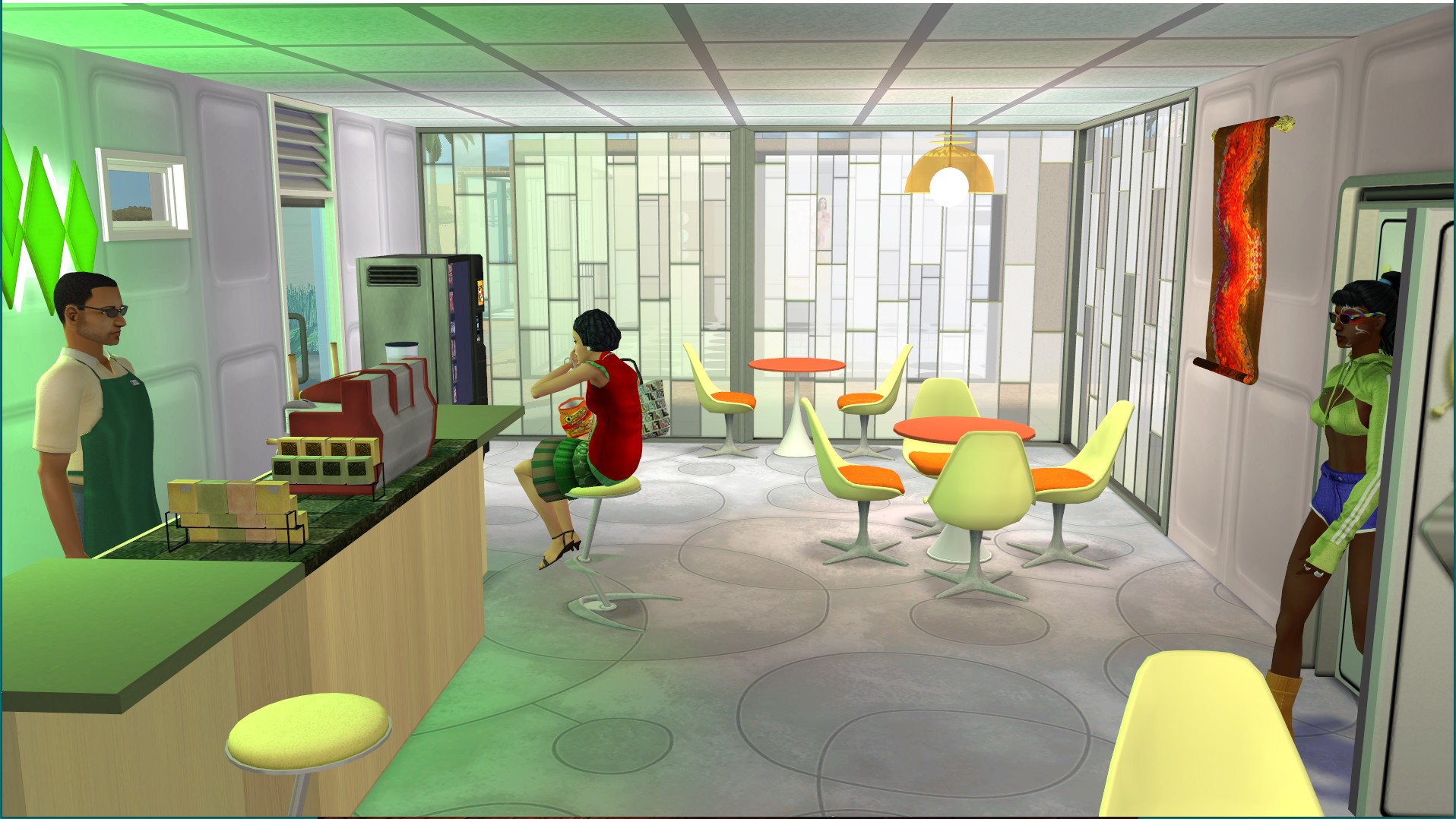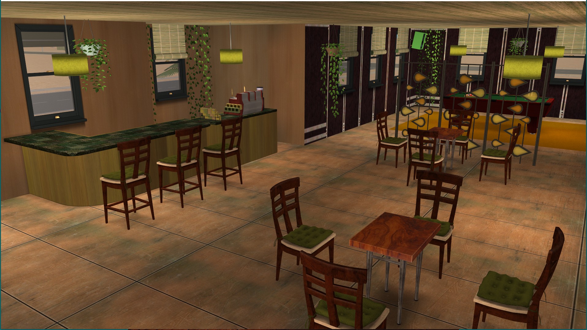 ). But in my latest neighbourhood I accidentally made a lot that was also great for socialising and that I really enjoyed. It was supposed to be an electronics store, but I didn't ave a single sim who might want to run it, so I took away most of the stock and just left a TV, a stereo and a karaoke machine. All my stores have toilets and showers and at least a vending machine for food, so it worked great as a hangout. For some reason it was where all the teenagers in the hood flocked, so in the end I just used the visitor controller and made it a teen hangout. In my head it was a sort of youth club.