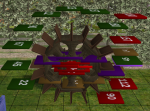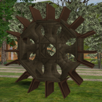 The water wheel - I know there are at least three CC water wheels out there which would be far better if I decide to build a mill, but the idea suddenly popped into my head of assembling a water wheel out of some bits of furniture, using angled OMSPs, and I had to try it right away. Eight tables, sixteen AL shelves, and far too many OMSPs - then I noticed that the lot I'd built it on had a cluttered background and I had to plant a bunch of trees in the road so I could take a clear picture of what I'd done. Then I thought it over and realised it would be much, much harder to position everything over a pond, where it would need to be - and it wouldn't be visible in hood view anyway. So that was a fun waste of time!