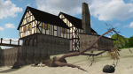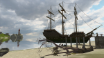 restored pirate ship. Plenty of decorating, putting nautical paintings in the office and barrels and straw and ginormous jugs (amphoras of oil or something) in the warehouse. But I thought the beach needed quite a lot of rocks and seaweed, and then I became discontented with the two bits of driftwood in the game and added some other logs, and then I hit on the idea of tipping over a dead tree on a 90° OMSP - of course, since the tree is meant to stand on the ground, it doesn't have any polygons underneath, so I had to hide the disconcerting hole with more logs and rocks. And the seaweed hanging in the tree branches is meant to go on the ground too, so it doesn't have visible faces on the underside - I rotated the camera and thought it had gone missing at first, then solved it by hanging another seaweed facing the other way.